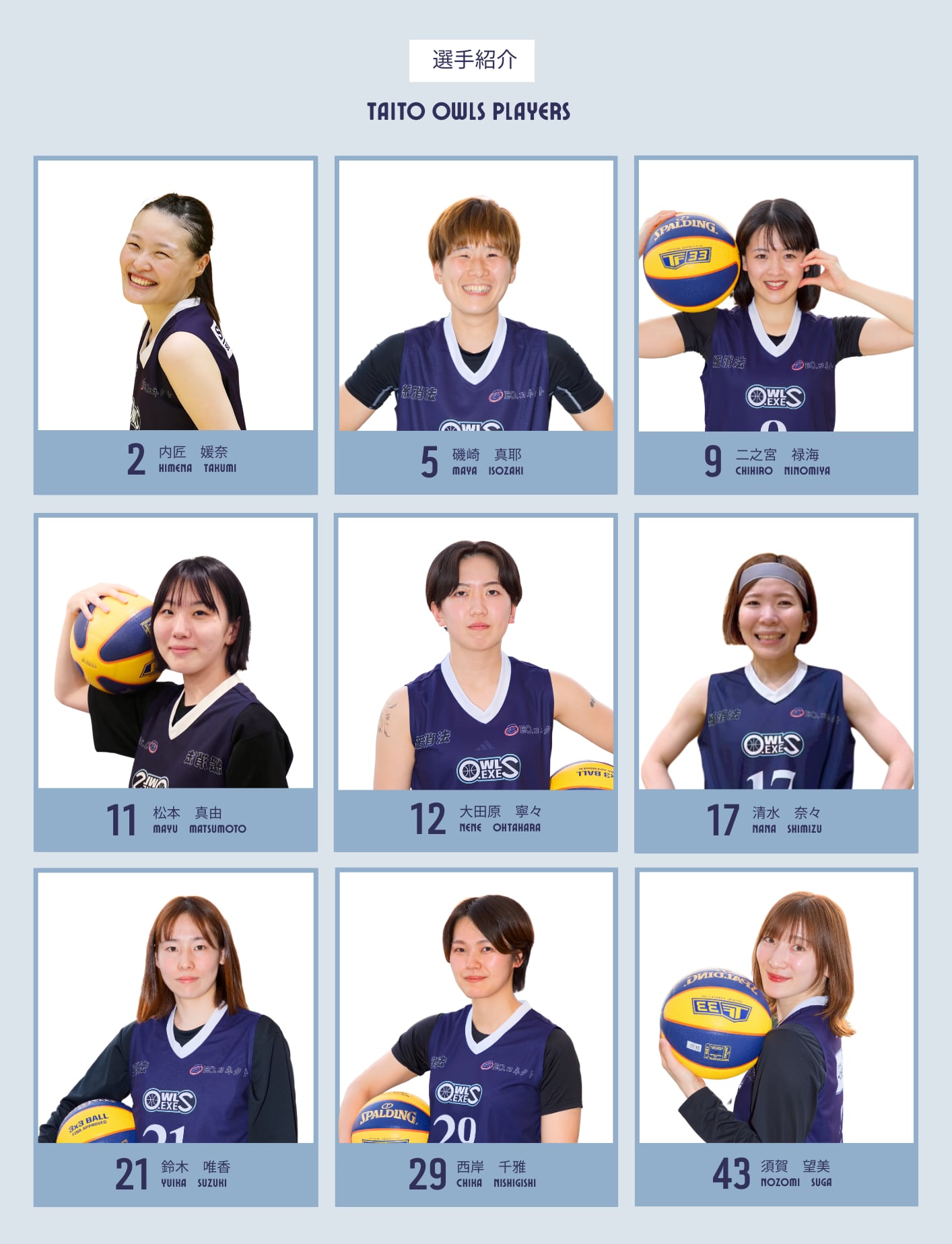 OWLSは東京の台東区を拠点に、情熱とチームワークで地域を盛り上げています。チームの精神を体現し、コート内外で活躍する選手たちをご紹介します。